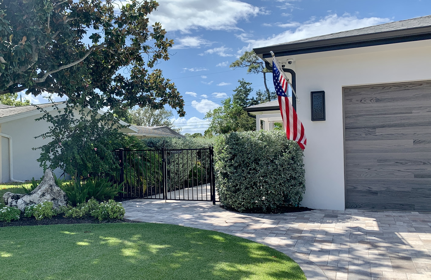 At the heart of the circular drive stands a graceful Canary Island Date palm, its tall fronds creating a striking focal point as you approach the house. The base of the palm is encircled by Duranta bushes, vibrant pentas and soft, swaying fountain grass, adding layers of color and texture that make the entrance feel inviting and full of life.