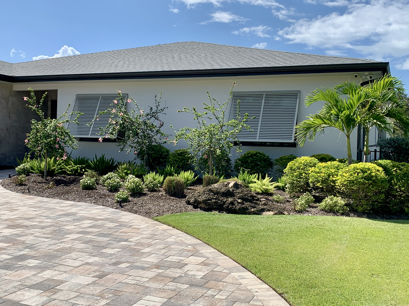 To the right of the front door, the airy canopies of three elegant La France hibiscus allow the house to subtly peek through to provide just the right balance of structure. Beneath them, bright pentas and lush foxtail ferns frame the space, drawing the eye toward a stately Triple Adonidia Palm surrounded by more Duranta bushes.