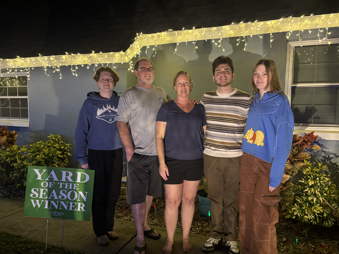 After sustaining significant damage from last year’s hurricane, the family decided this year’s theme would be all about color and fun and it became a true family project. Their oldest son, Julian pitched in while home from college and 15-year-old McKinley reached a milestone, climbing on the roof solo to hang lights. Daughter Charlotte also pitched in, carefully lining the front sidewalk with lights to complete the display.