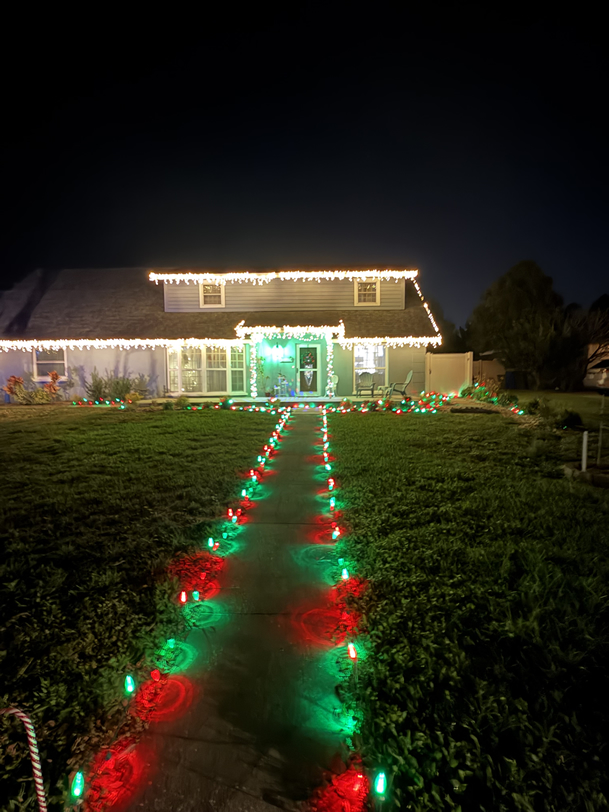 The sidewalk up to the front door is lined with alternating red and green lights. That was another kid-inspired idea, designed as a festive runway for Santa and his sleigh.