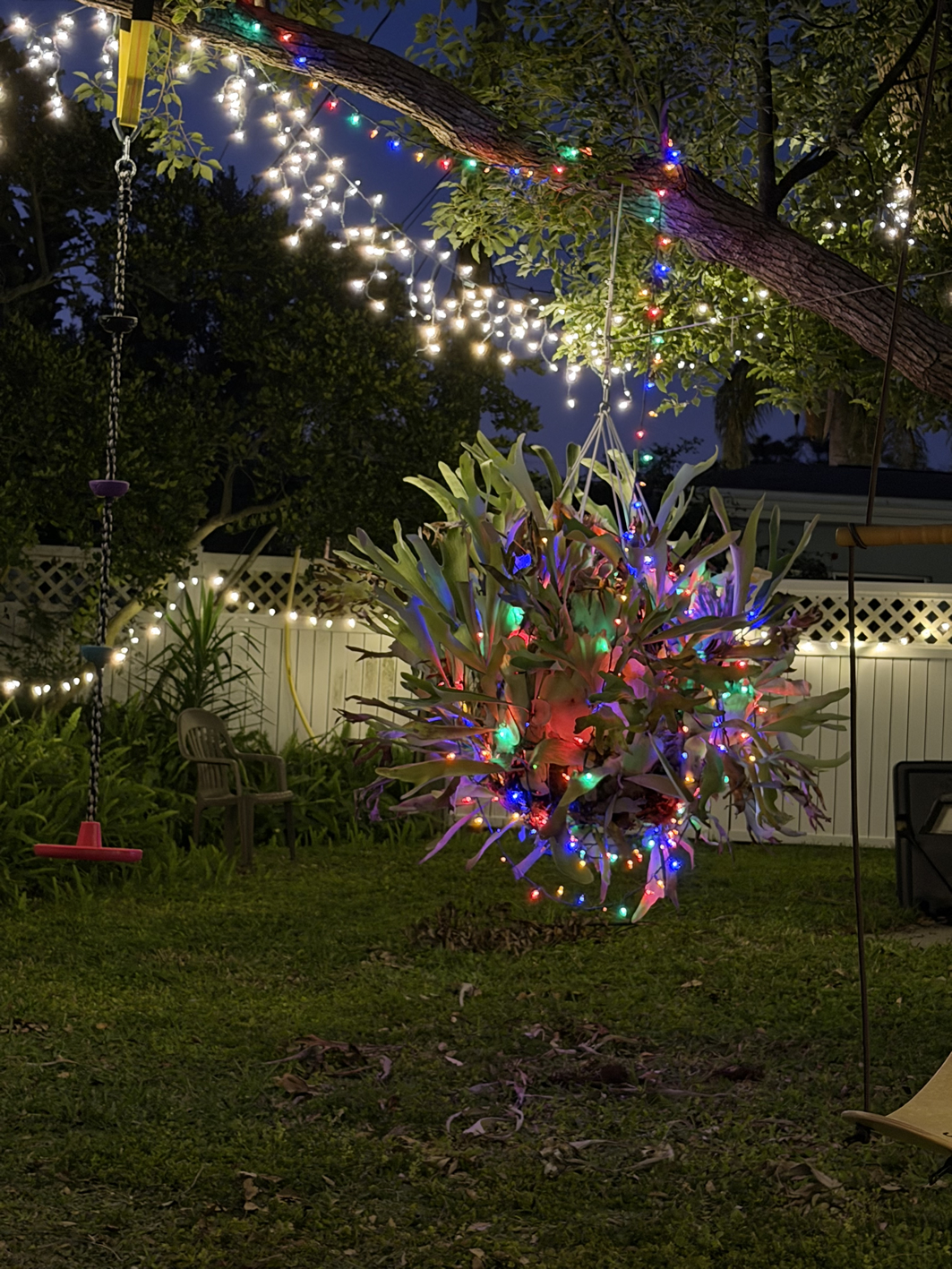 Perhaps the most meaningful element of all is the staghorn fern hanging from an oak. It once belonged to Jamie’s 96-year-old grandmother, and in a touching tribute, the children suggested lighting it in their great grandmother’s honor—adding a heartfelt and meaningful layer to an already unforgettable display.