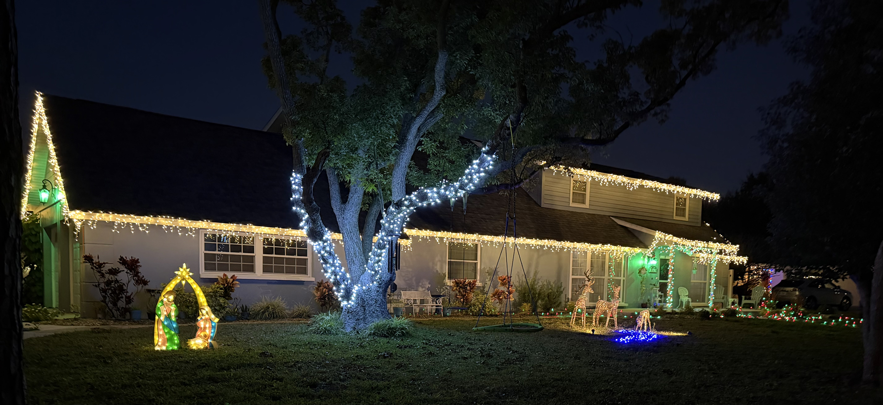 The Mills home is a showstopper, drawing the eye from the glowing roof line down to the beautifully illuminated trees. Icicle lights installed along the front and side of the house and draped across the majestic camphor trees create a magical look. Under one tree is a Nativity setting, showing the true meaning of Christmas.